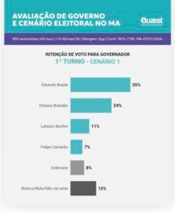 A Quaest entrevistou , nesta rodada, 900 eleitores, em 49 municípios do Maranhão, entre 12 e 16 de março de 2026. O nível de confiabilidade é de 95% e a margem máxima de erro é de 3 pontos percentuais. Registro no TSE: MA-07211/2026.
