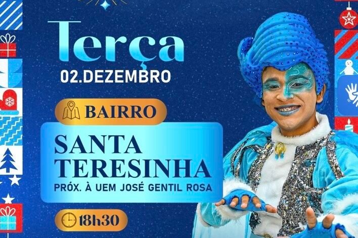 O espírito natalino vai tomar conta do Residencial Santa Terezinha nesta terça-feira, 02 de dezembro, com mais uma edição especial do Natal Iluminado Itinerante. A programação será realizada próximo à Escola José Gentil Rosa, reunindo famílias e moradores para uma noite cheia de magia e emoção.