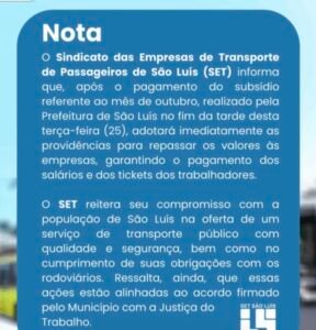 O Sindicato das Empresas de Transporte de Passageiros de São Luís (SET) informa que a Prefeitura de São Luís realizou, no fim da tarde desta terça-feira (25), o pagamento do subsídio referente ao mês de outubro. Diante disso, o SET adotará imediatamente as providências necessárias para repassar os valores às empresas, assegurando o pagamento dos salários e dos tickets alimentação dos trabalhadores.