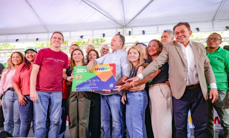 O secretário de Estado de Agricultura e Pecuária, Fábio Gentil, ao lado do governador Carlos Brandão e outras autoridades em entrega simbólica de cartão do programa Tempo de Semear