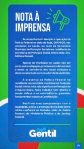 Gentil Neto frisou que a presença da PF na residência da secretária municipal de Proteção Social, Dra. Adriana Raquel, sua mãe, não significa confirmação de irregularidade. Ele defendeu a ampla defesa, direito assegurado a todos cidadão pela Constituição brasileira.