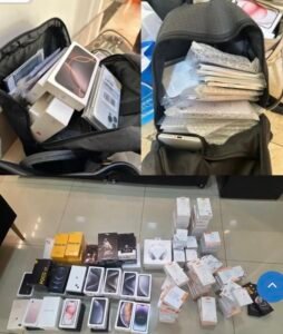 Bolsas com dezenas de aparelhos foram abandonadas na recepção do prédio Uma pessoa tentou fugir transportando 40 iPhones, mas foi interceptada Apesar das irregularidades encontradas, não houve prisões.