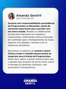 Amanda Gentil disse ter recebido a missão com responsabilidade, ciente do momento importante que o partido vive no Maranhão. “Recebo as deliberações da Executiva Nacional com respeito e compromisso, reafirmando minha disposição em contribuir para o fortalecimento da nossa legenda com diálogo e sintonia com as instâncias partidárias”, ressaltou.